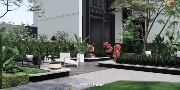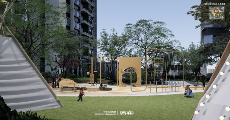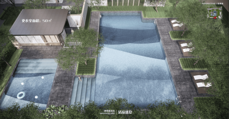 景观泳池——室外度假泳池:约360㎡成人泳池+约60㎡儿童泳池,设置独立更衣室,保障私密性同时兼顾功能性;增设休闲躺椅,提供多元社区休闲交流空间。