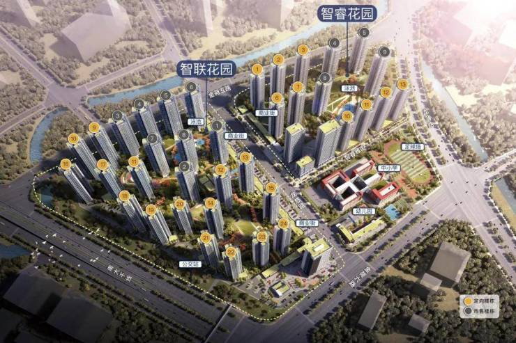 项目由四个地块组成,总共有41栋楼,其中住宅37栋、公寓4栋,以合围点式的布局,涵盖了住宅、公寓、商业及教育配套。