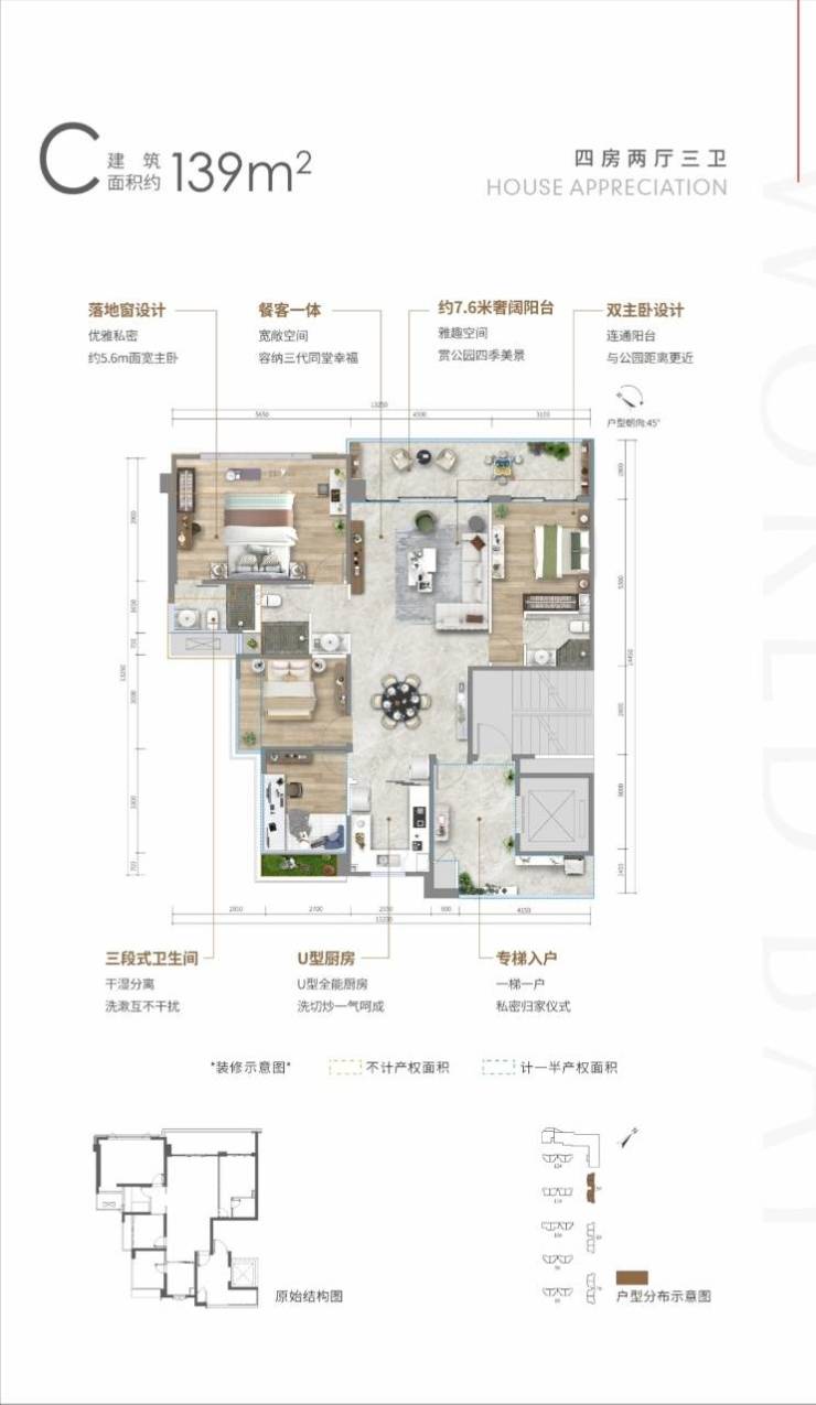 🏠C户型: 约139㎡四房两厅三卫、层高25层