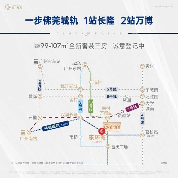 轨道交通:距离城轨东环站仅150米,1站可达长隆站可换乘地铁3号线、7号线;2站到万博,可换乘18号线;6站直达珠江新城。