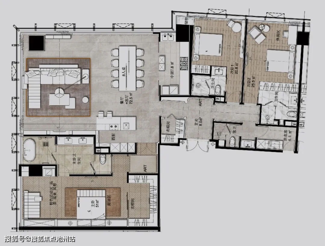 流畅动线,主次分明,主入口约8㎡尊荣玄关,尽显名流礼仪涵养。