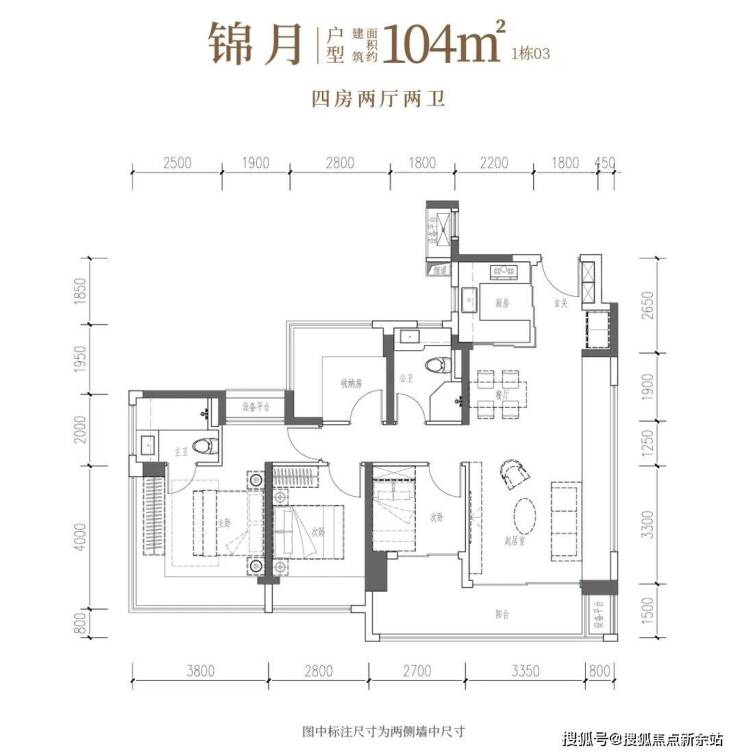 竖厅格局,客厅4.15米开间,S墙预留冰箱位,四开间朝南,主卧270°无柱转角飘窗还带1个设备平台约1.52平,分别做到了主卧20.34㎡/次卧11.2㎡/次卧7.7㎡/次卧6.75㎡(包含墙体飘窗),U型厨房烟道外置,得房率约100.71%(包含赠送),客厅连接次卧出大阳台约11.23平,西南朝向。