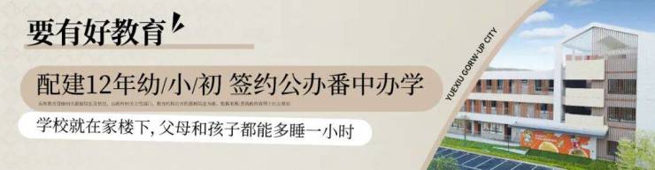 越秀星汇锦城配备12班幼儿园、42班小学、36班中学,学校建设已封顶;