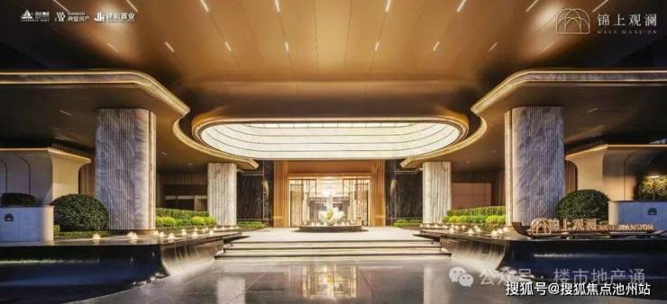 高奢酒店式大门宽80米,高度9米,门廊挑高,吊顶采用圆弧形的穹顶,铺满梵高白奢石和古驰黑石材;四根梵高白立柱托起古铜色铝板,中间做了水景雕塑,归家仪式感拉满