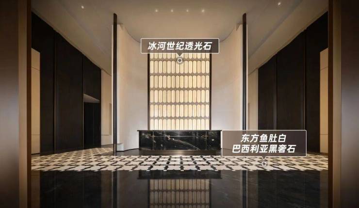 一进大门,整个入户大堂以宝格丽酒店设计风格为灵感,每一个细节都透出映射质感。约7米高的艺术移门辅以奢石弧形墙面,以强烈的仪式感,勾勒通往越秀·万博和臻的“玄关”。