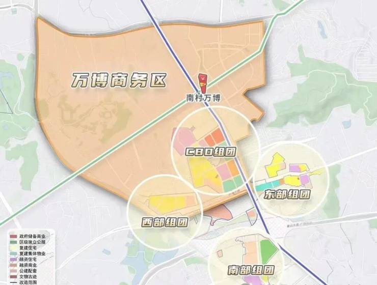 根据规划,整个万博城大致可以分为4个组团,每个板块特性不尽相同:CBD组团、东/西部组团、南部组团三部分。