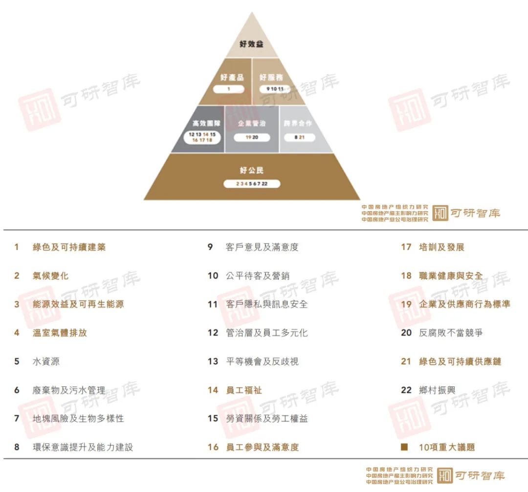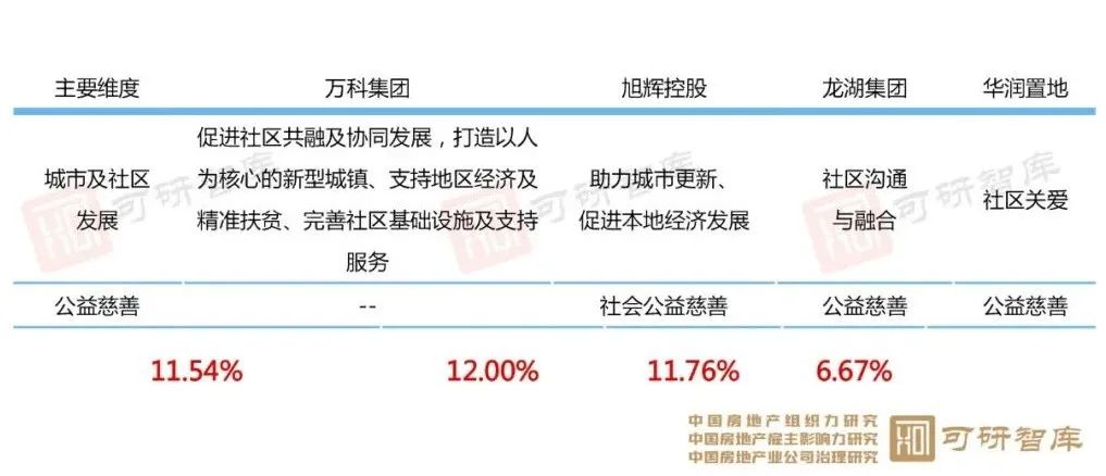 不同房企在重大性议题的分类上略有不同,如华润置地的重大性议题分为社会、环境、管治等5大维度,本文为统一对比口径将所有重大性议题按企业经营、客户管理、员工关爱、城市社区、环境保护、社会责任等6大维度进行划分。