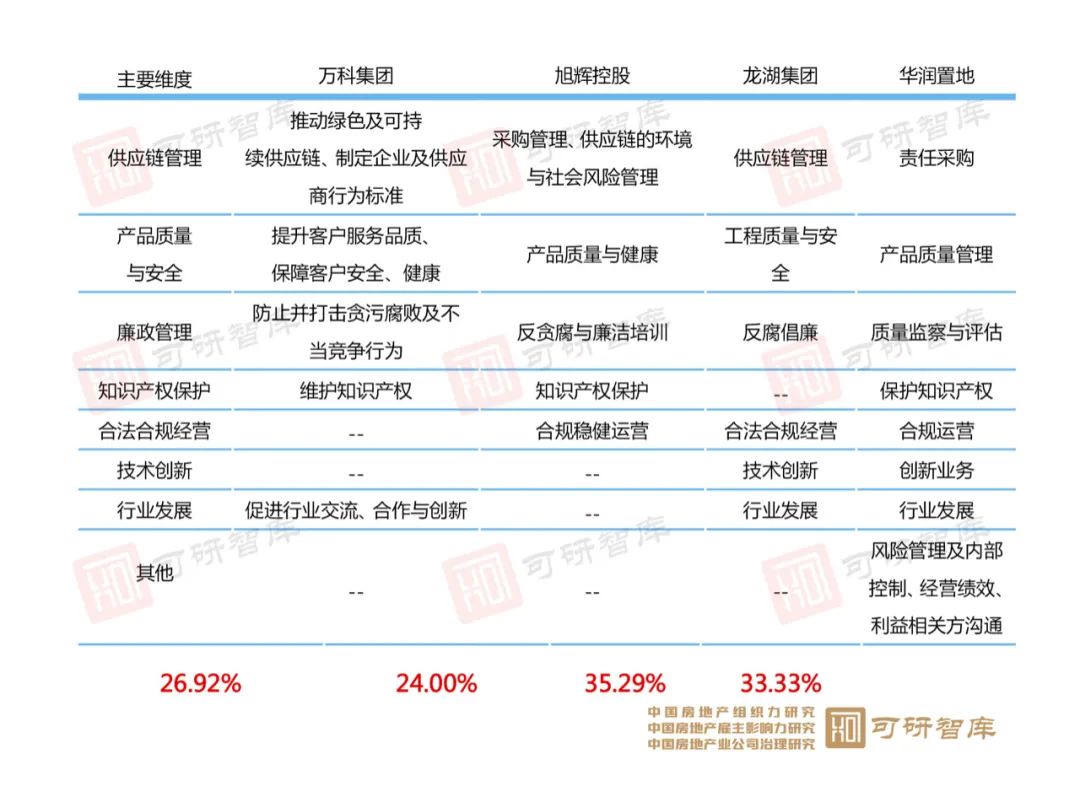 企业经营方面的议题数量基本占到各公司议题总数量的24%以上,与环境保护一同成为ESG议题多样性中占比较高的两类议题,足见目前房企对其重视程度。企业经营议题范畴内,各房企对采购管理、产品质量与安全、廉政管理的重视程度较高。4家房企都有针对性的议题出台,其次是知识产权保护、合规运营等方面也是房企目前的关注重点。