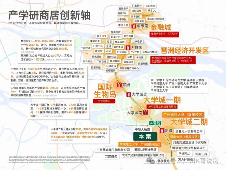 项目位于大学城二期-国际创新城板块,国际创新城共十平方公里,有暨南大学和广州医学院,整个创新城包括北翼的生物岛,核心的大学城和南翼的南岸起步区,南村地区,化龙地区,国际展贸城,在空间结构上形成了一核两翼。