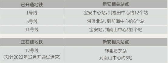 临靠5号线洪浪北地铁站D出口,向南3站到达宝安中心站,6站到达前海湾站,向北2站到达留仙洞总部基地,7站到达深圳北站;15号线(规划中),联通大铲湾、南山西丽和科技园片区。