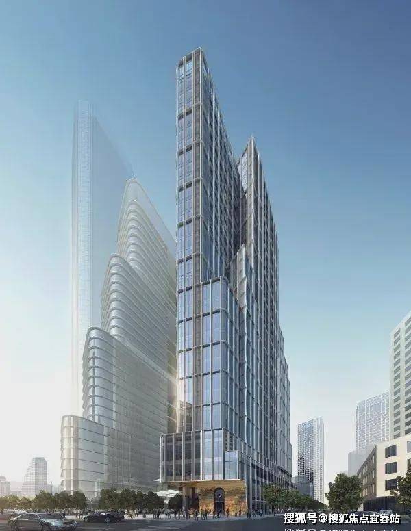 以“竹”和“笋”为意向,重铸笋岗新封面。外立面采用玻璃幕墙通过折线坚向构件隐喻竹子形态,高低错落的体量组合寓意着竹子簇拥生长的挺拔与活力。裙房外立面为玻璃幕墙+铝板幕墙+艺术马赛克,通过提取竹笋的弧形,形成反弧建筑形态,将公共架空空间和商业空间涵盖在内,并运用意大利进口马赛克将《清明上河图》艺术化地展现在反弧的墙面内,形成独具中国特色的现代城市地标景观。