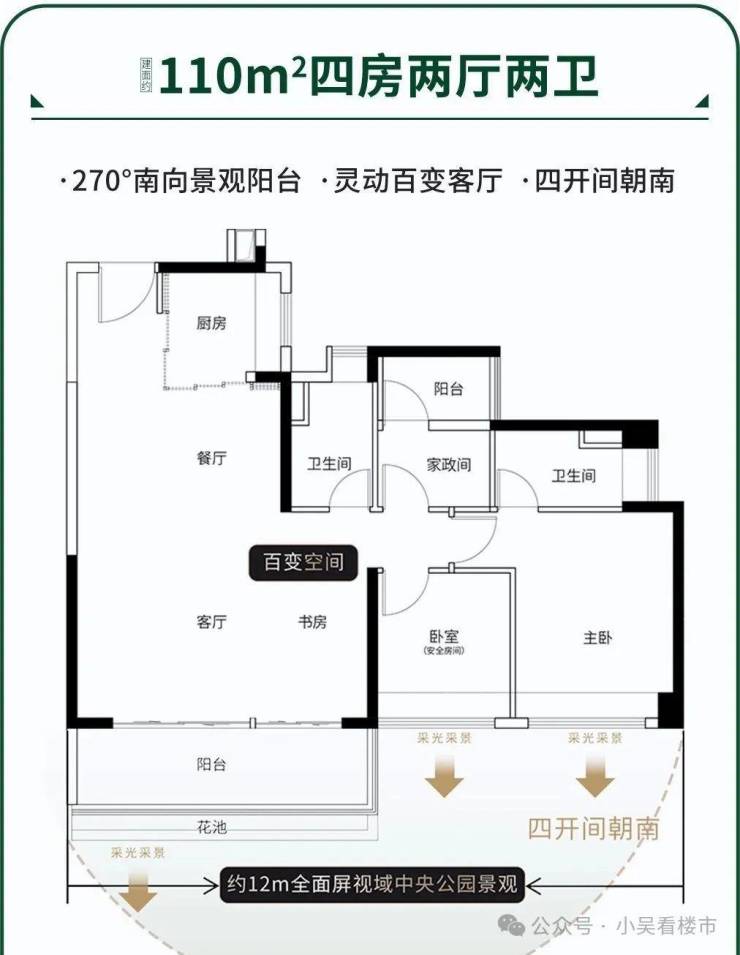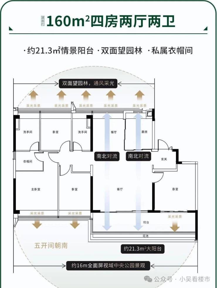 项目主打纯改善精装户型,涵盖113-175㎡四房产品,均价约4.2万元/㎡,总价420万起,现房发售所见即所得。采用纯板楼、100%南向布局,两梯两户或两梯三户设计,部分户型实现专梯入户,楼间距宽阔无遮挡,搭配南偏东20°科学扭转设计,户户望公园,同时甄选高端装修标准,兼顾私密性与居住质感,适配多代同堂改善需求。