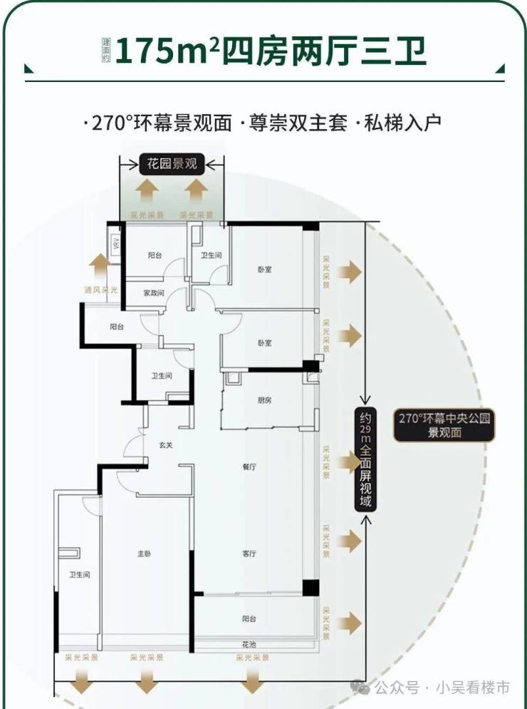 而且全部是两梯两户,或两梯三户,建面约140、165、175㎡的户型,都能做到专梯入户,私享宽阔电梯厅,电梯门一开,便是你的专属世界,私密性拉满,低密、纯板楼,两梯两/三户,这样的产品在主城区,十个手指就能数完,是真正属于买少见少的稀有臻品。