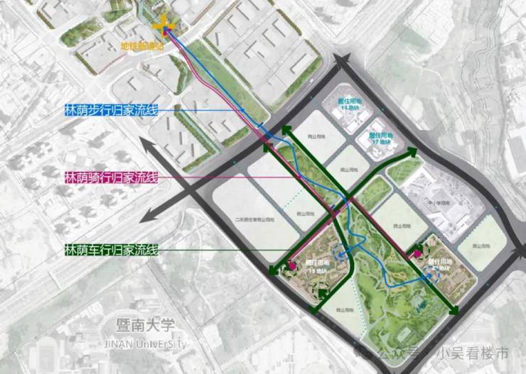 目前从项目走去地铁站需要绕路,走到南大干线上,后续公园建好了,出来小区,预计600米就能到地铁口,而且都是公园路。