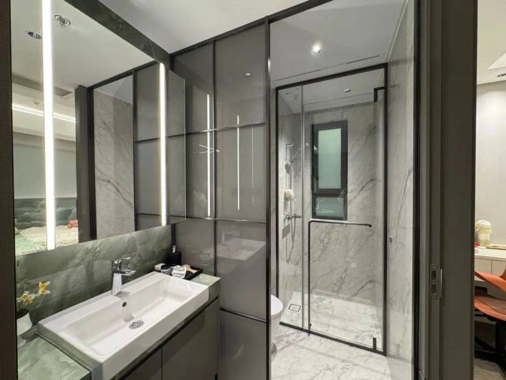 卫生间的洁具都是高仪零售款。主卫部分,目光所及之处几乎全是岩板,这个台面使用的浅绿色大理石也有个好听的名字“只此青绿”。
