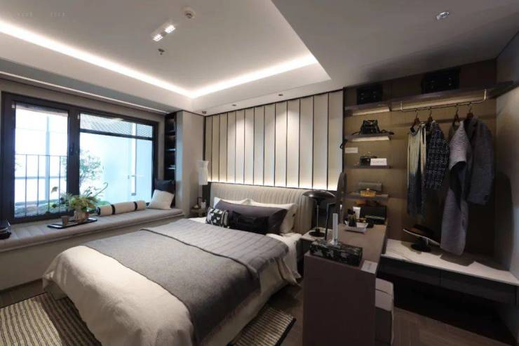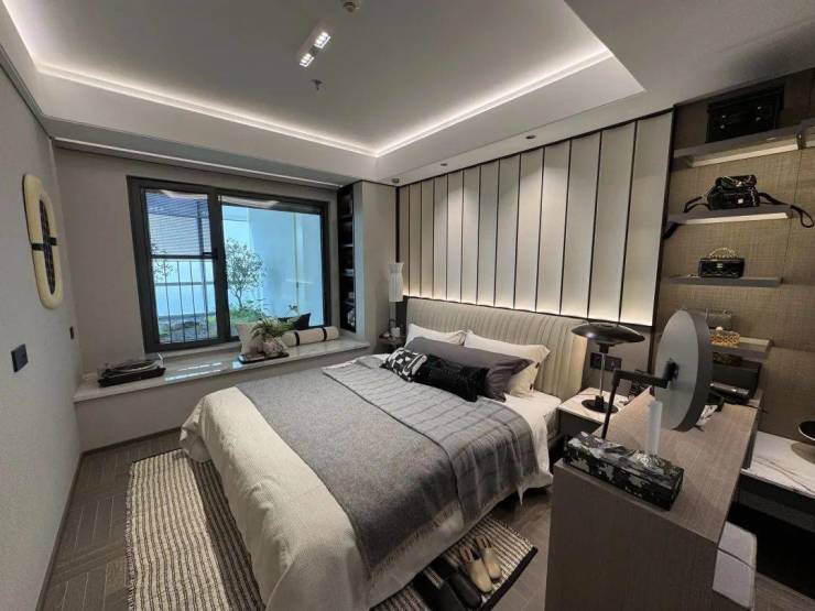 国誉府这个98㎡是飞机户型,本身比动静分离的三房空间利用率要高一些,加上又是纯洋房,天然的高得房率,因此这个主卧尺度感非常好,比一般户型主卧更大、更方正,主卧床头背景墙也是交付标准。