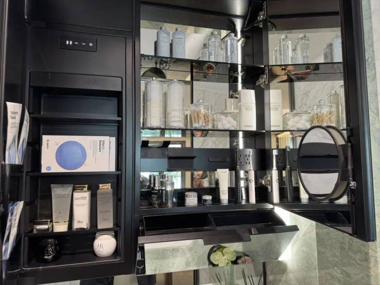 主卫镜柜内置美妆冰箱,还有下方化妆工具的收纳格。