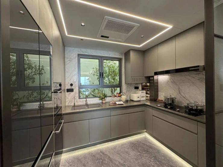 厨电采用的是全套博世——双开门冰箱、油烟机、燃气灶、洗碗机、蒸烤一体机、暖碟机。还有3M末端直饮水,弗兰卡水槽+龙头,特别是这个大金厨房空调,厨房专用的防油烟的款,造价比寻常空调更贵。