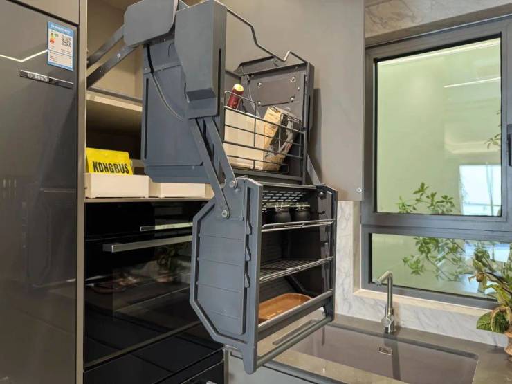 厨房收纳是小编觉得非常实用的款式。比如蒸烤一体机上方的橱柜做了一个下拉篮,下拉后的高度,一个一米六个子的人无需踮脚即可拿到东西。