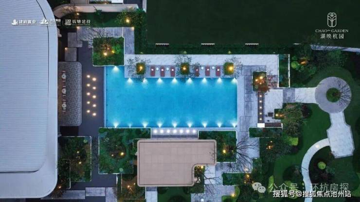 潮映杭园的公园,并不是简单种些花草了事。设计上借鉴了西湖景致的灵感,规划了“五幕十景”的游园动线,比如复刻“苏堤春晓”意境的曲线游廊、映照水景的中央湖区等。园区内还规划了约2800㎡的阳光大草坪、约560㎡的网球场、约300米的环形慢跑道,甚至还有一个约400㎡的无边戏水池,让人联想到度假酒店的体验。