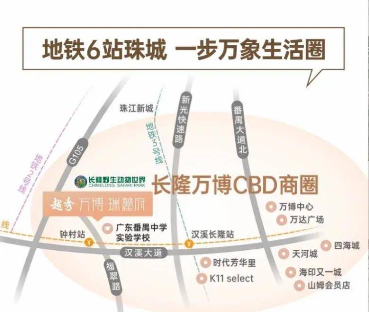 自驾的话,家门口钟顺路连接汉溪大道、南大干线(已开通),双动脉横贯番禺核心,约10分钟长隆万博CBD,约30分钟珠江新城