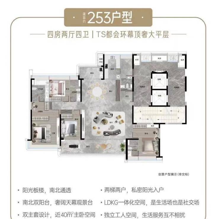 ·中轴园林上,环幕景观楼王·限量级CBD低密板式高层·专梯专户 | 私属电梯门厅,尽显私密尊崇·四开间朝南,南北对流阳光满格·双阳台设计,约10.3米宽巨幕阳台·双主卧套房,让孩子多一度独立空间·总统级主卧奢套,步入式衣帽间、双洗手台、浴缸