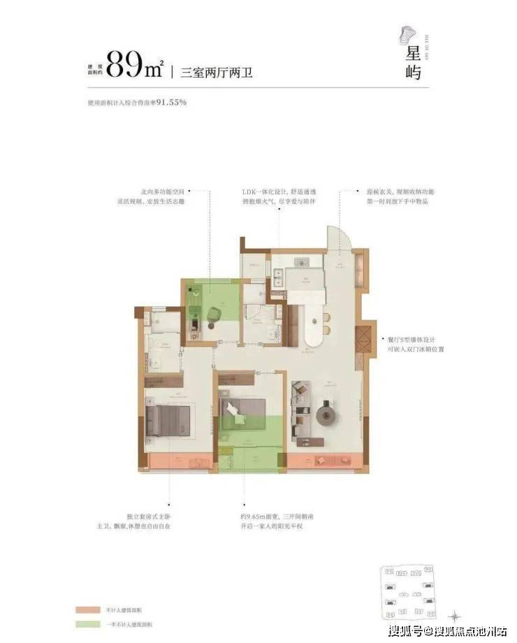 沐芳洲主力户型建面约89-132方,最高实际得房率达到100%,是目前杭州得房率最高的新盘之一 。