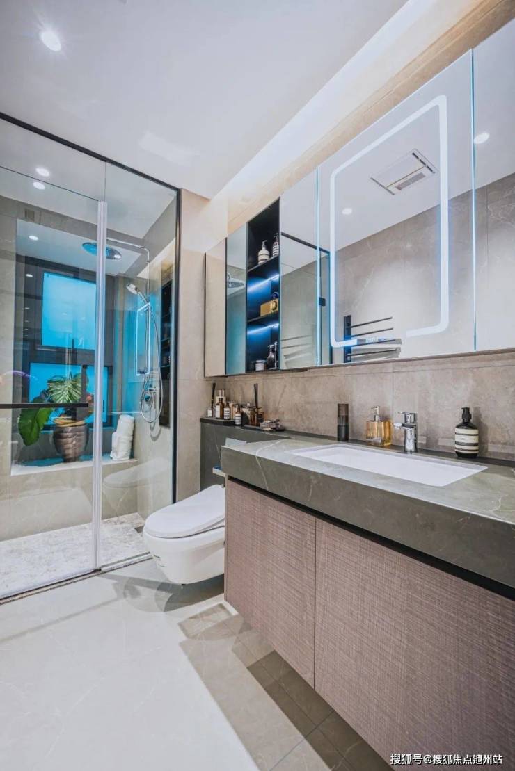 在卫生间,唯宝洁具和壁挂式马桶,吉博力同层排水,高仪恒温花洒(带顶喷);在主卫,还配置了美妆冰箱,细节拉满。