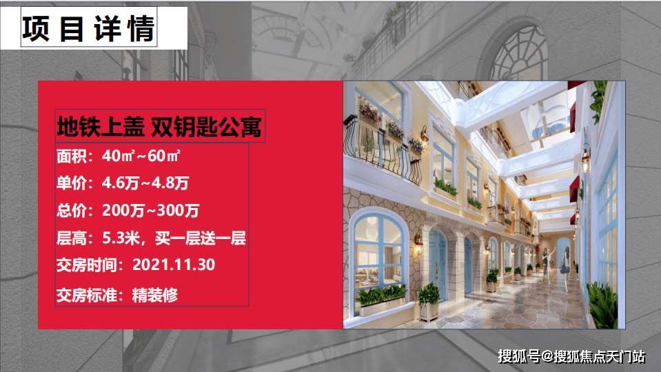 项目说辞:总占地1.8万方,总建面3.2万方,由1.5万商业中心加3层4层220套层高5.3米精装公寓组成,2022年1月30日交付