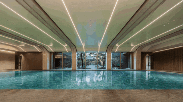 建筑立面: 采用“现代东方宋式风格”,仿石铝板一体板、木纹铝板、暖金色金属线条勾勒,与绿城在市中心的高端项目一脉相承,历久弥新。