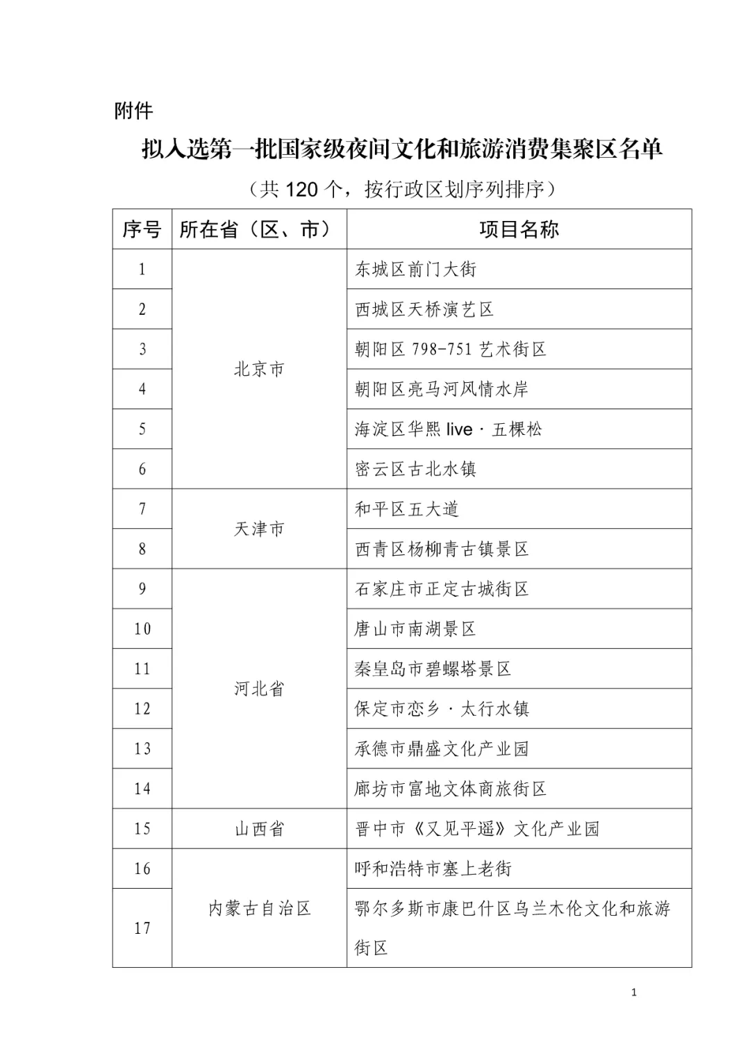 10月19日晚,文旅部微信公众号发布拟入选排名前列批高级夜间文化和旅游消费聚区名单。通知称,根据《文化和旅游部办公厅关于开展排名前列批高级夜间文化和旅游消费集聚区建设工作的通知》,经地方申报、省厅推荐、合规性审查、专家评审、舆情风控、实地考察等方式,拟确定北京市东城区前门大街等120个项目为排名前列批高级夜间文化和旅游消费集聚区。