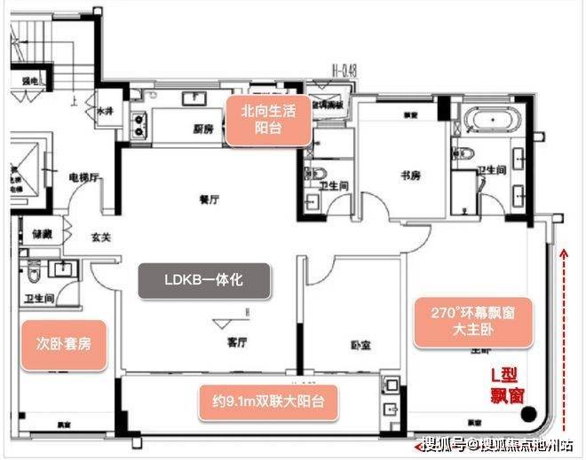 比如4#楼东边户大户型,整体南向面宽就有约17.05米!还有专厅入户、南北双阳台、超奢级LDBK,再加上270°的卧室飘窗,将大家族的排面体现得淋漓尽致!