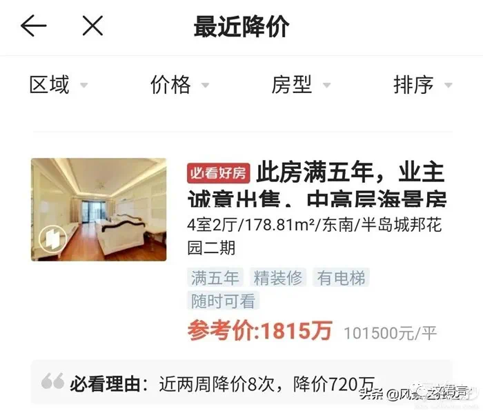 值得关注的是,南山的半岛城邦一套满5年的179平单位,两周时间内降价8次,总降价幅度达720万。