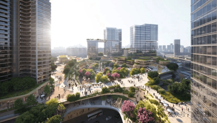 由于该地块是在车辆段上加双层盖板来建设综合体,共18条车道,打造多种交通方式无缝衔接的“零换乘”交通体系。
