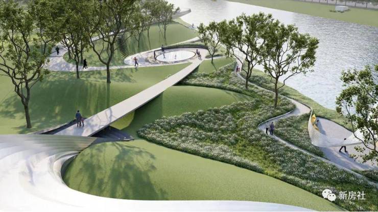 面对琶洲南TOD黄埔涌与赤沙涌双水岸环抱的自然禀赋,项目特地邀请全球最顶级的景观设计公司——美国SWA,以“隐秘的繁盛”为主题,打造了滨河公园。项目的