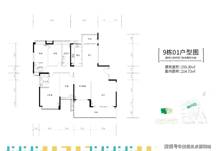 9栋,两梯两户,建面约255-259㎡五房大平层户型。