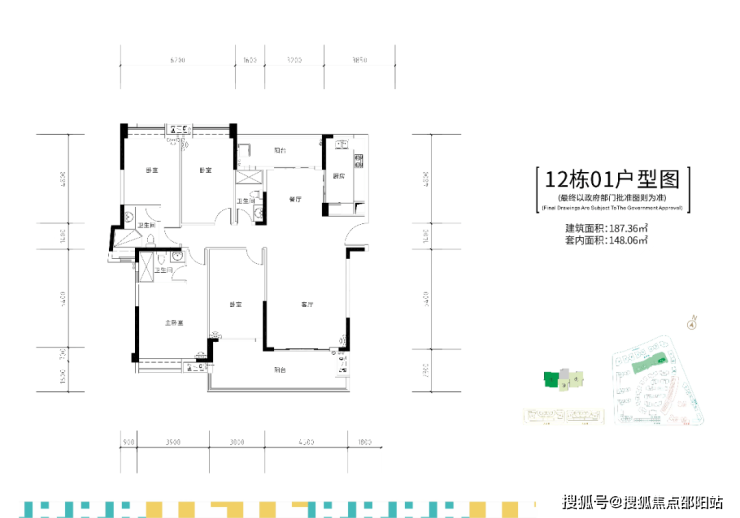 12栋两梯三户,建面约187㎡四房双套间户型。