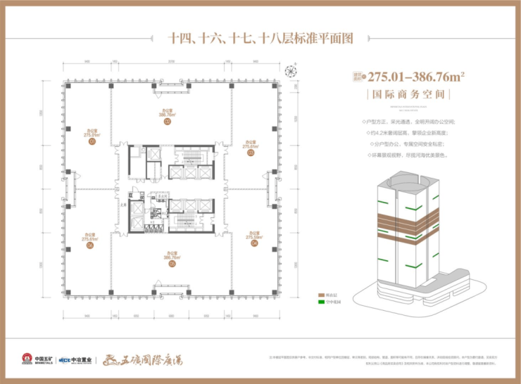 【楼栋概况】楼体高度110米,地下二层地上22层,1-4层为城市中芯底商,首层层高约6米、2层层高约为4.5米、3/4层层高约为4.35米;5至18层为国际商务空间,层高约为4.2米。