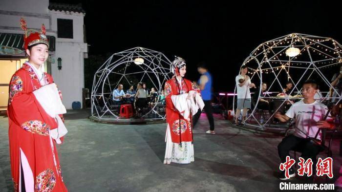 夜幕降临,江风徐来。在香湖湾的临江民宿前,一场祁剧户外表演加露天烧烤正在进行,众多游客在此吃烧烤、品祁剧。