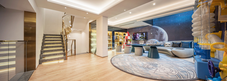在不受打扰的下层自成天地,和宝贝一起组装洋娃娃、小赛车,或是静静地陪他画画、写字。仰望看高空飞过的小鸟,夜晚陪孩子数星星赏月亮,让思绪一起飞到外太空。
