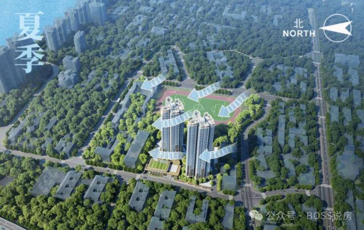 项目地块较小,由2栋30-33层的塔楼组成,楼栋通过扭转一定的角度,实现了户户朝南,实现约80%梯腿望江