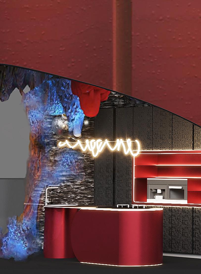 法迪奥从“共生·无界”的设计理念出发,把“溶洞”元素引入展馆设计中。