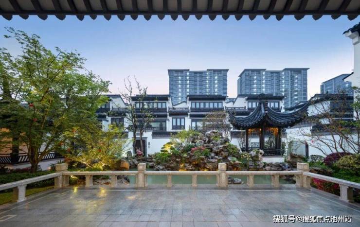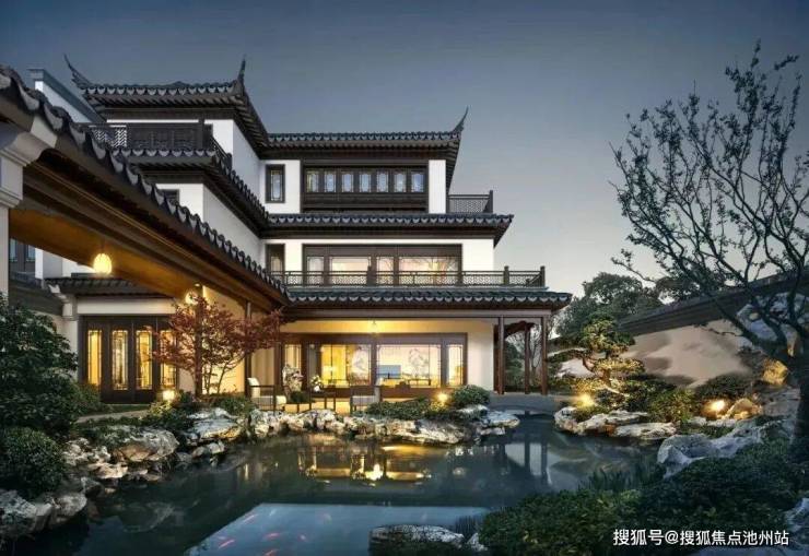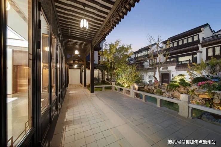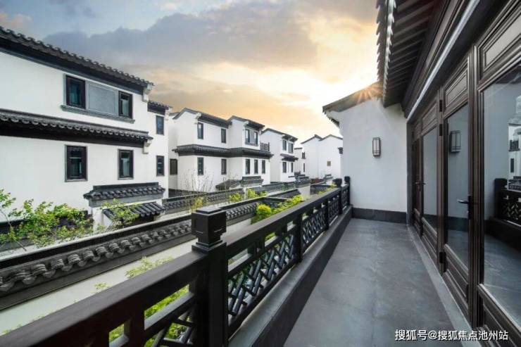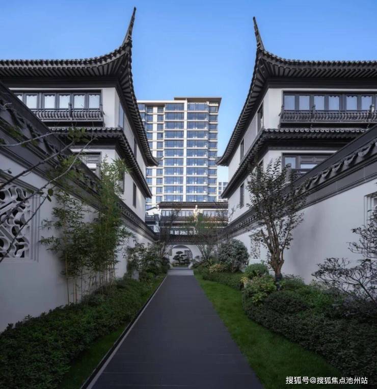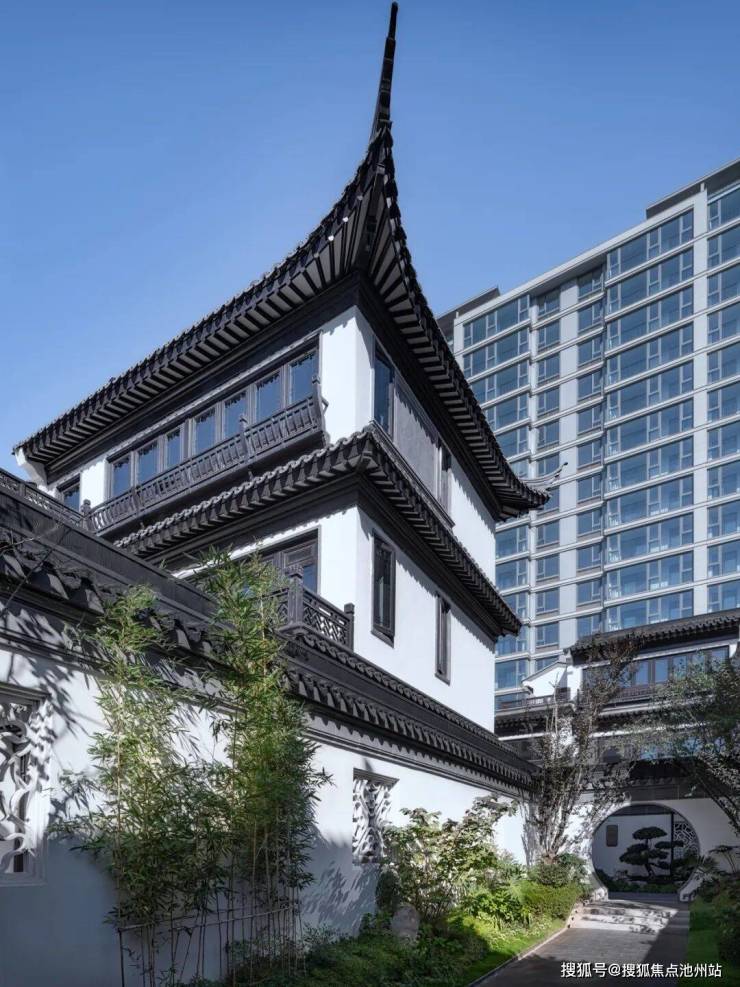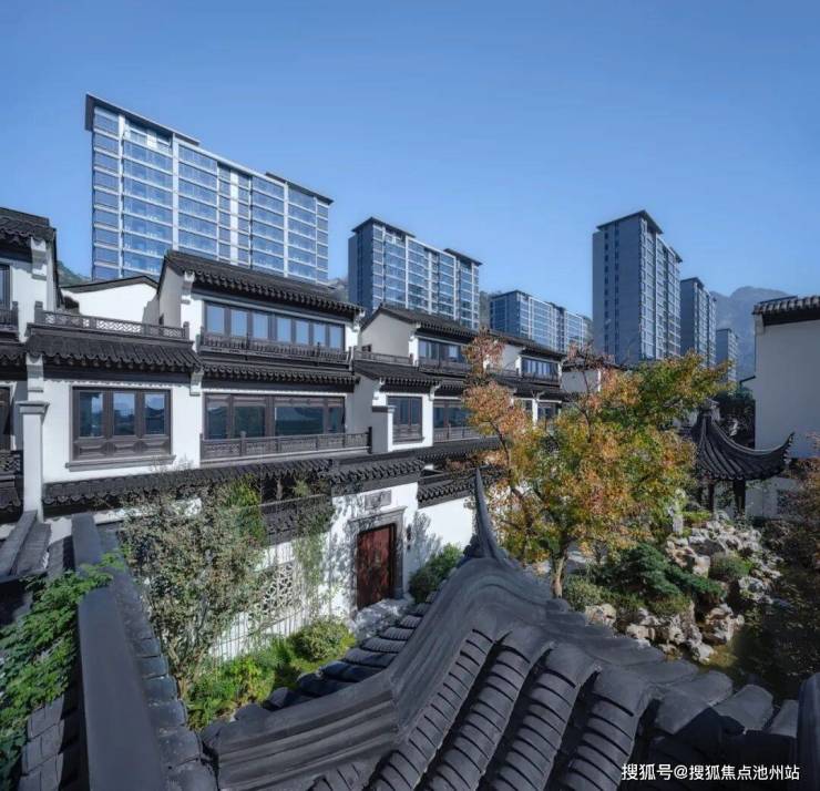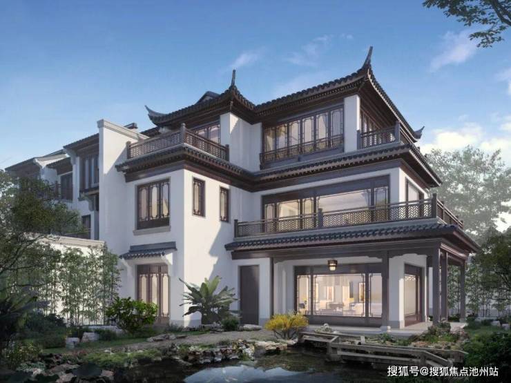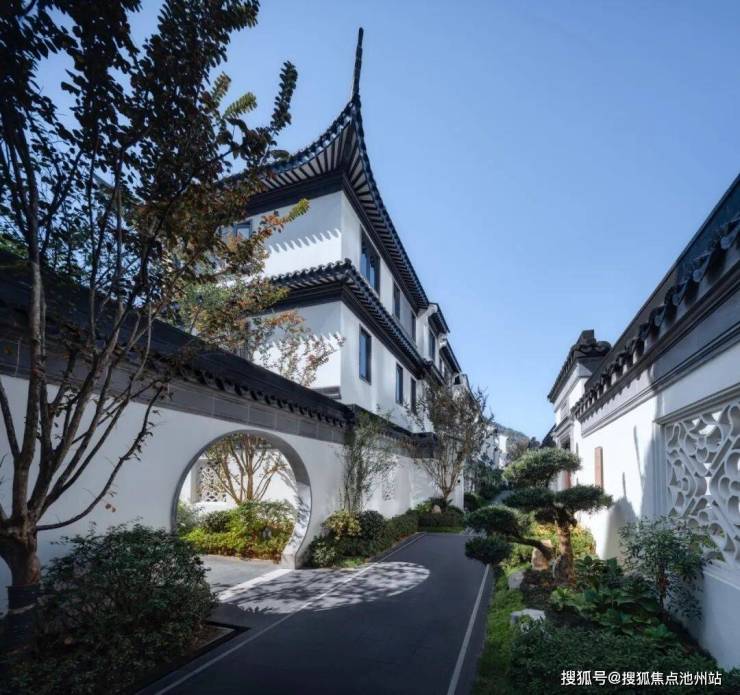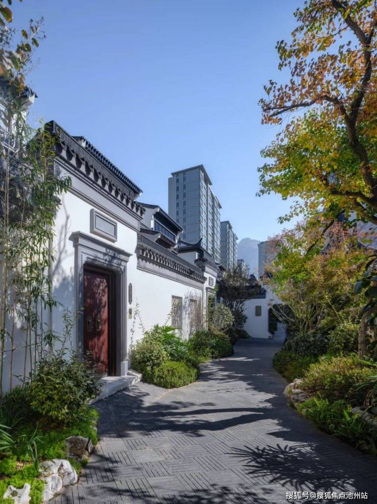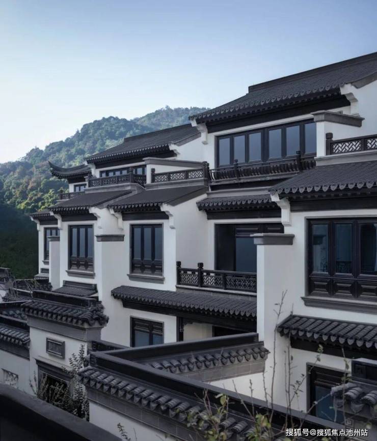 合院均采用中式建筑风格,延续江南建筑粉墙黛瓦与和暖色木材的经典搭配,精心雕琢建筑细节,将传统建筑中的屋脊、栏杆、门窗、垂花柱、戗角等元素进行再次设计,利用现代的材料和构造手段,结合时下审美,反复斟酌建筑留白与材质搭配,巧妙利用建筑与空间的关系,营造中式传统意境之美。