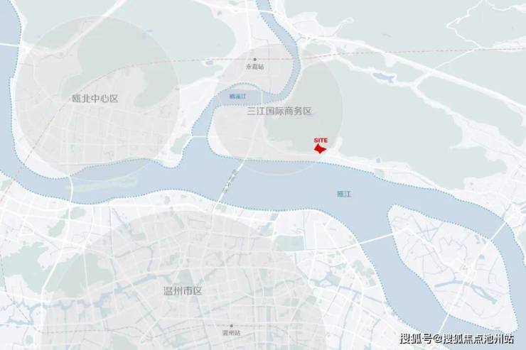 地块位于永嘉城市发展新区——三江国际商务区,梅园村,处于瓯江与楠溪江交汇处,与温州市隔江相望。基地当前主要通过104国道与三江国际商务区连接,未来梅园路也将扮演重要角色。通过过境的诸永高速瓯越大桥可便捷连通温州市区,未来还可经瓯江北岸的环江大道,通过沉管隧道与市区连接。