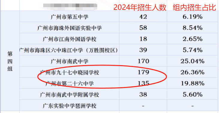 2023年以前,这个分组南武大头,4成学生可以进去,但是到2024年,第四组一共摇679个学位,相对比较差的26中、97中占比提高,一共招生314人,过半的学生进去了这两所学校。