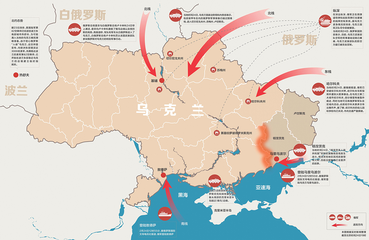俄罗斯总统普京24日清晨发表电视讲话说,决定在顿巴斯地区发起特别军事行动。乌克兰总统泽连斯基当天晚些时候发表讲话说,乌克兰决定与俄罗斯断绝外交关系。普京在讲话中说,俄罗斯没有占领乌克兰的计划,期望议会对在顿巴斯采取军事行动持统一立场。他同时表示,相信俄公民会支持这一决定。