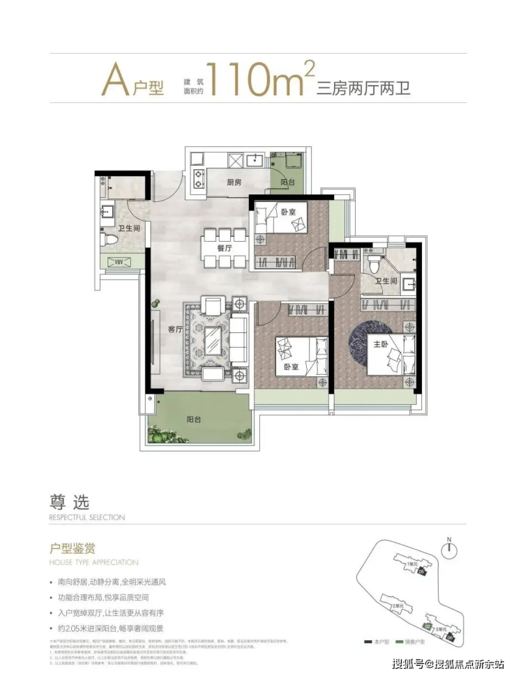 110㎡的3房2厅2卫,A户型,设计的是竖厅格局,客厅3.9米开间,LDKB一体化设计,三开间朝南,3个卧室分别做到了主卧15.95㎡/次卧12.6㎡/次卧9.18㎡(包含墙体飘窗),L型厨房还带1个小生活阳台,卫生间干湿分离,得房率约79.24%(不含赠送),阳台进深2.05米,西南向。