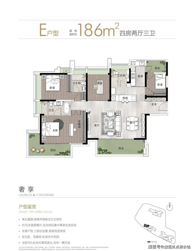 186㎡的4房2厅3卫,仅1栋2单元E户型,设计的是横厅双阳台格局,板楼设计,进门入户玄关,客餐厅7.5米开间,LDKB一体化设计,三开间朝南,双套房设计,4个卧室分别做到了主卧23.65㎡/次卧17.55㎡/次卧12㎡/次卧8.1㎡(包含墙体飘窗),中西厨房设计,卫生间干湿分离,得房率约78.83%(不含赠送),西南朝向。