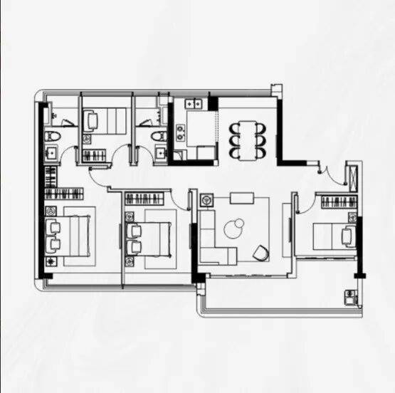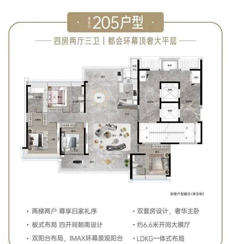205㎡四房两厅三卫是环幕景观户型,配备近 9 米宽的巨幕双阳台,双主卧套房设计,长辈房带独立卫浴,避免日常起居干扰。