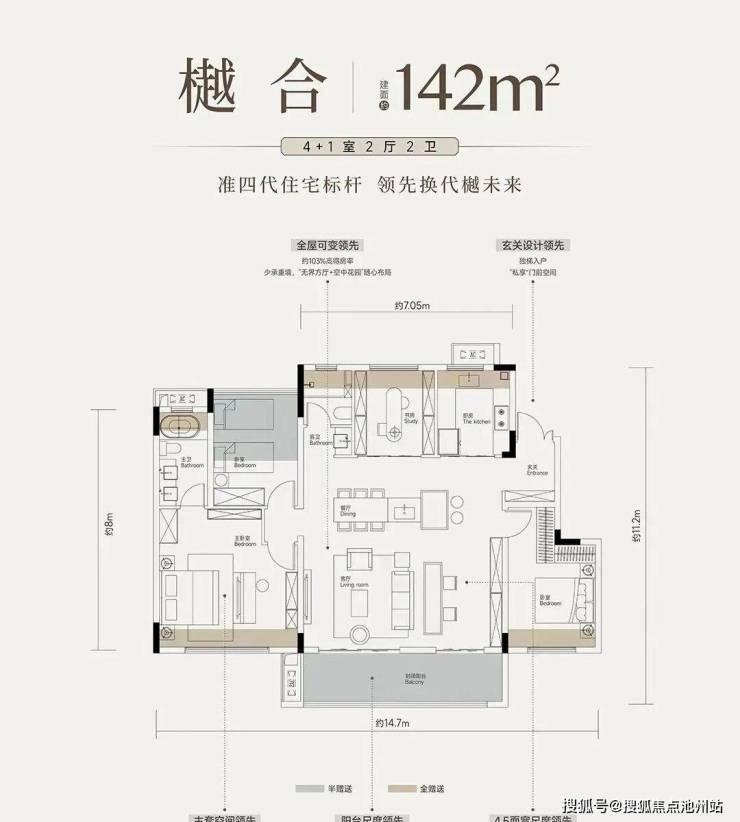 樾和户型建面约142平4+1室两厅两卫:前面有分析,南北通透,6个飘窗,2个阳台,优化面积非常多,约14.7米的南向开间,通透性和舒适度都非常高。